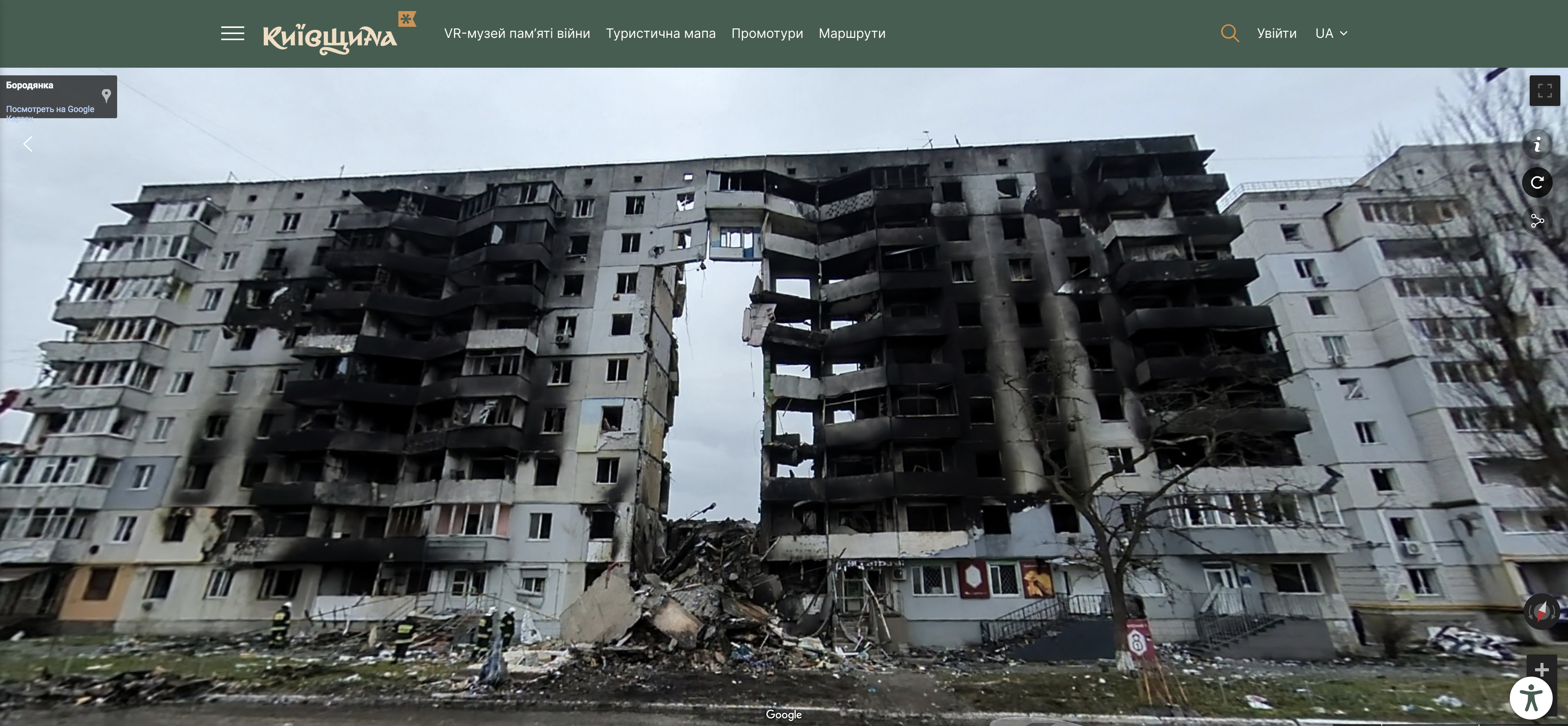 Ми писали про ще один музей — проєкт «Війна впритул» від розробників Kyiv Maps. Це віртуальні тури з 3D-панорамами зруйнованих об’єктів Києва та області.