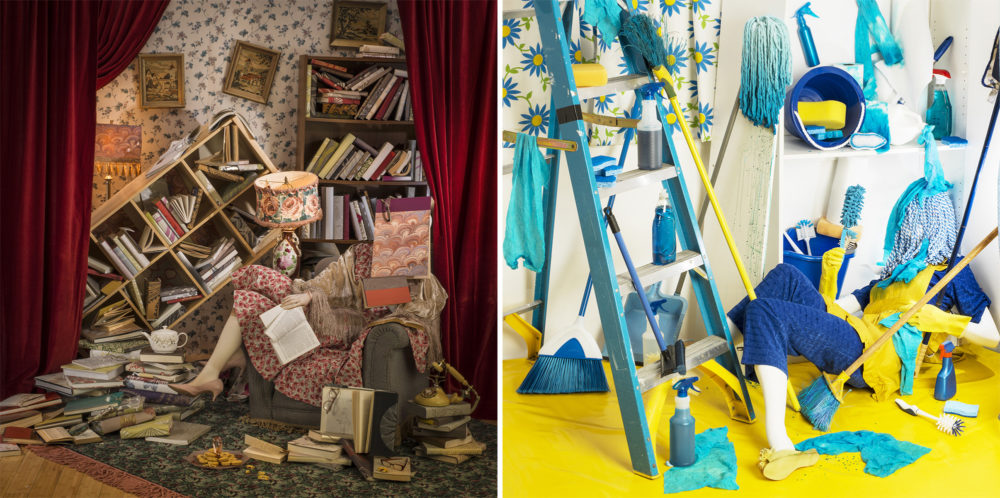 «Женщина становится жертвой навязчивых идей, ее жизнь — это череда беспорядка и казусов. Слишком много книг, предметов на полках кладовой и алкогольных напитков подавляют женщин», — описывает фотограф свои работы.