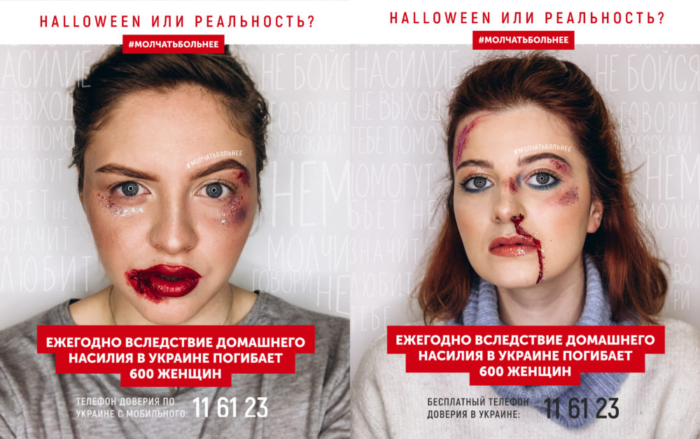 Так родилась идея сделать рекламу против домашнего насилия. «Halloween или реальность?» — спрашивает плакат. Ежегодно 600 украинок погибают от домашнего насилия, сообщает статистика ООН. На плакатах также указан телефон национальной горячей линии для жертв домашнего насилия: 11-61-23.