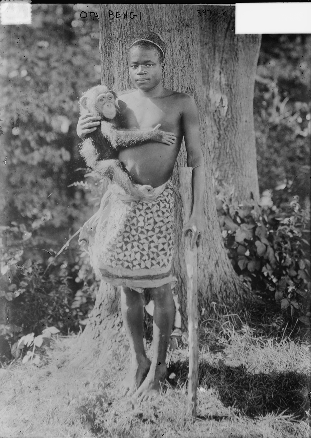 Це пігмей Ота Бенга, якого виставляли у зоопарку Бронкса в Нью-Йорку разом із мавпами та іншими тваринами. Конголезький пігмей жив у клітці з шимпанзе, а потім з орангутангом та папугою, стріляв з лука.