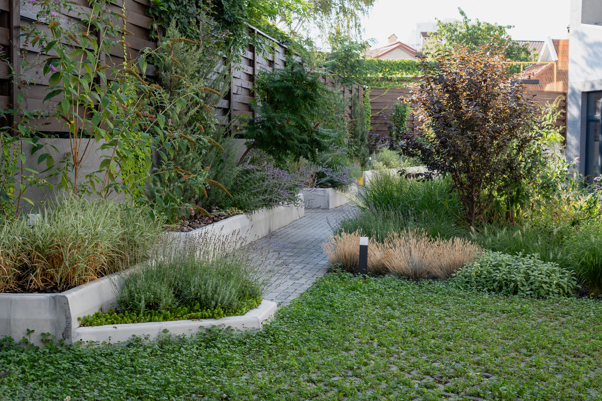 • використання у благоустрої натуральних матеріалів — тобто це має бути некольорове мощення, архітектурний бетон, щебінь, некольорове дерево, зістарений метал;