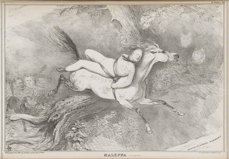 Образ Мазепи використовували навіть у сатиричних цілях. Ось Джон Дойл зображує короля Великобританії Вільгельма IV під час Виборчої реформи 1832 року.