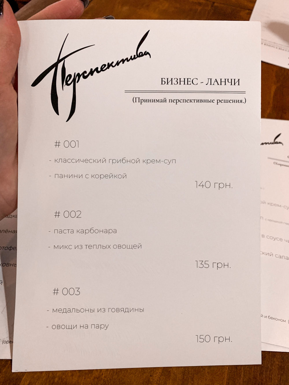Бизнес-ланчи — по 140 гривен. На выбор суп, паста и медальоны из телятины.