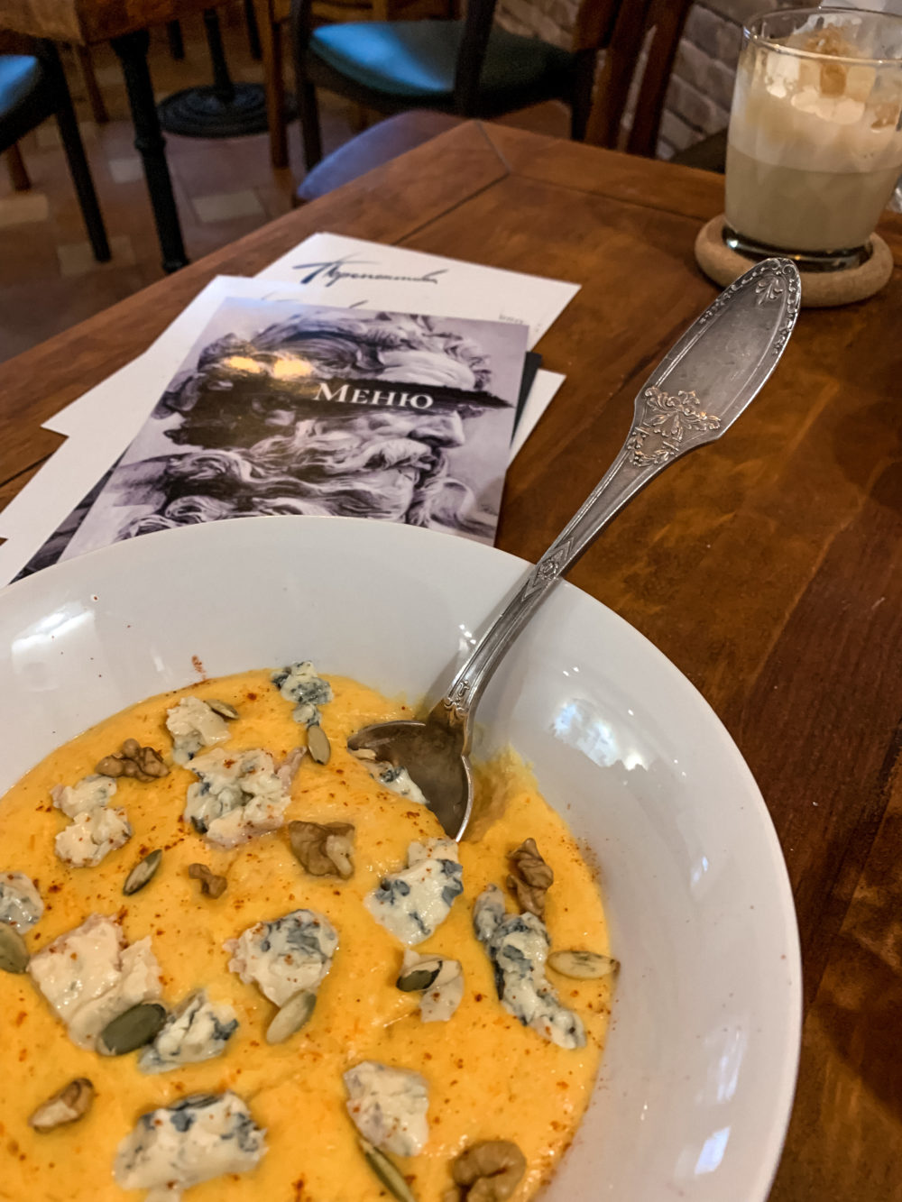 Попробовали суп «4 сыра» — 120 гривен за порцию. Сытный и слишком густой. Доесть полностью так и не получилось. Потенциально это очень вкусное блюдо, но технология его приготовления кажется недоработанной.