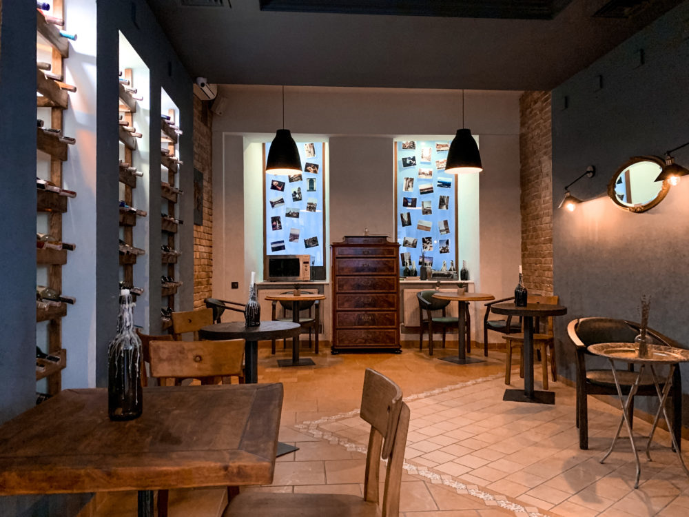 Заведение открылось в этом месяце, и все процессы еще не отлажены, некоторая суета чувствуется сразу, как только заходишь внутрь. Персонал разбирает поставки прямо у бара, коробки и пакеты лежат там же. Хочется верить, что так будет не всегда. Помещение бывшей кофейни «Шико» преобразилось и однозначно похорошело. Здесь больше нет угрюмой деревянной мебели и огромных витрин-холодильников в зале. Света и воздуха стало больше, а мишуры на полках меньше, золотистая табличка у дверей привлекает внимание посетителей к старинной кирпичной кладке. А вот грязные кондиционеры остались.