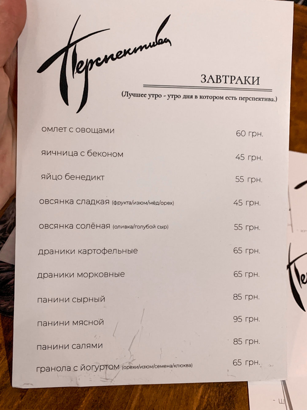 В меню есть завтраки, которые подают с 9:00 до 12:00. Предлагают блюда из яиц, драники, гранолу, овсянку и три вида панини. Цены приятные, яичница с беконом, например, стоит 45 гривен.