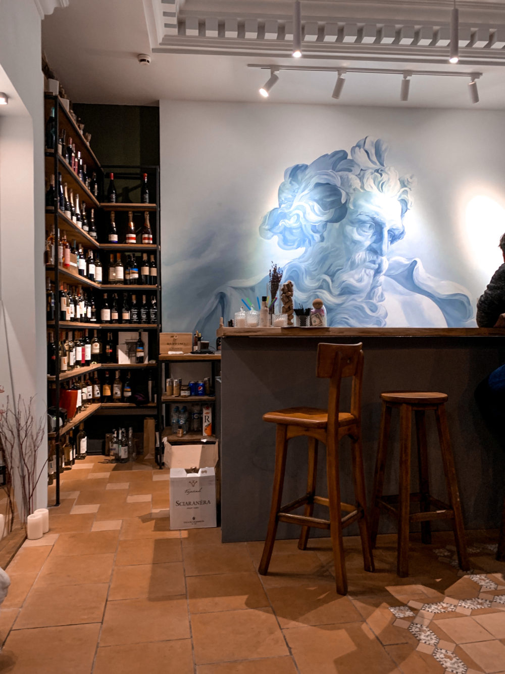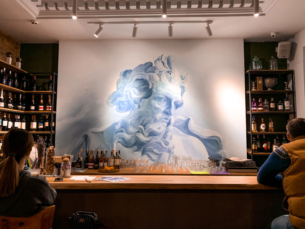 На стене за стойкой изображен Нептун, он же украшает меню. Скульптура-прототип была создана в эпоху барокко Адамом Ламбером-Сигибертом. Это действительно красивый рисунок, и Нептун отлично смотрится рядом с кофемашиной и кексами. Студенты художественного училища, которое находится буквально за углом, наверняка оценят такой элемент интерьера. А каждый человек с ноутбуком будет рад розеткам возле большинства столов.
