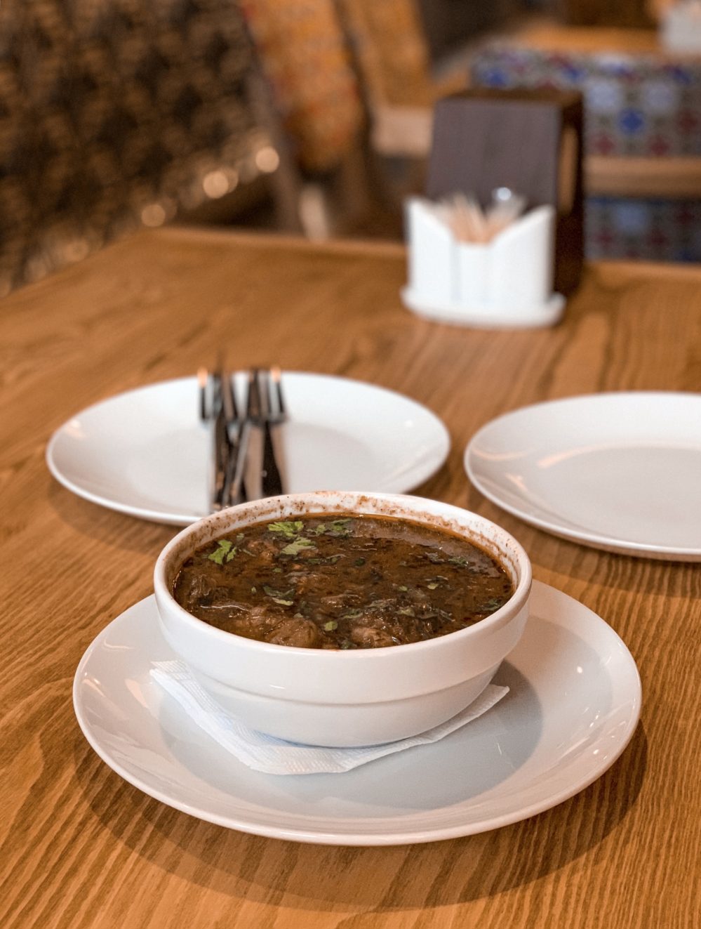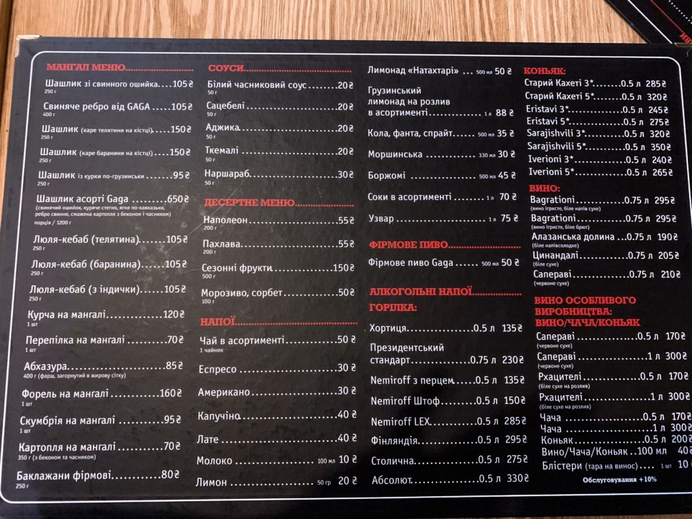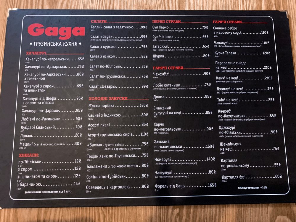 На страничке Gaga в Facebook указано, что это «ресторан для настоящих друзей», и мы догадываемся, почему. Хачапури таких размеров, что им непременно захочется поделиться! Попробовали хачапури по-аджарски с телятиной (85 гривен) и суп харчо (75 гривен) — обе позиции щедро приправлены и отлично приготовлены.