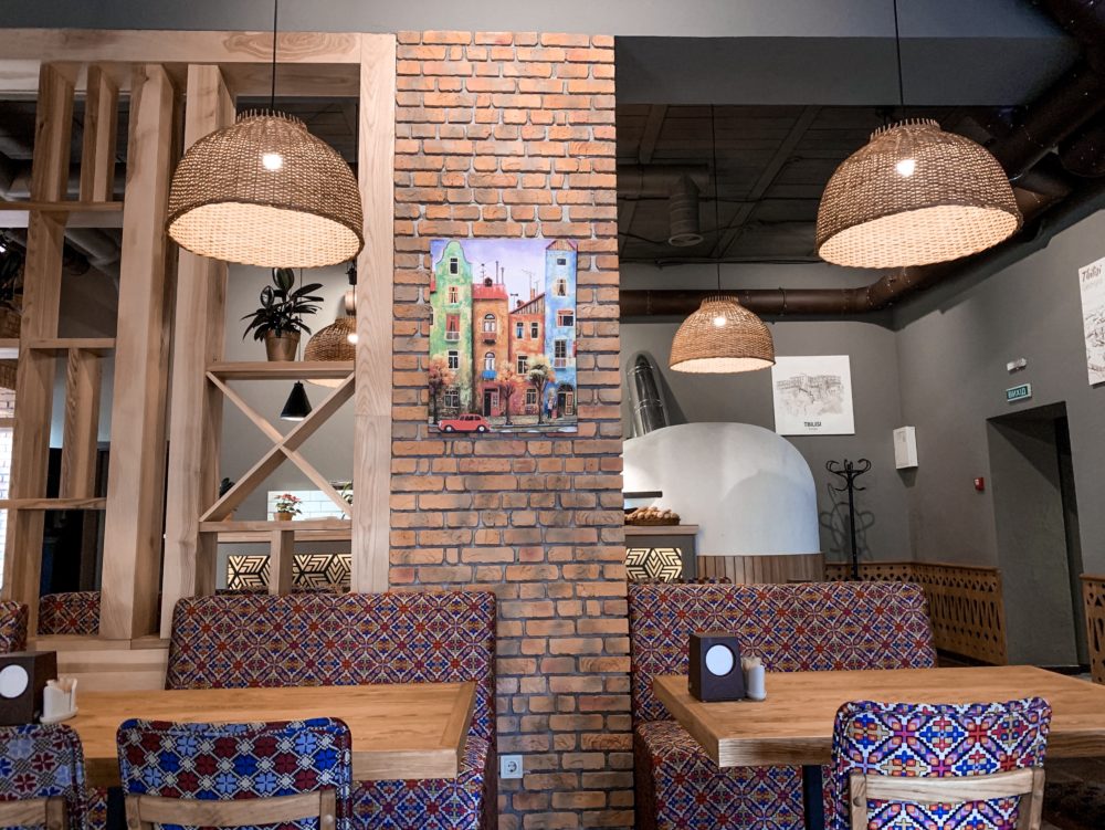 В ресторане довольно простой интерьер — высокий потолок, теплый цвет кирпичной кладки, деревянные детали и яркие рисунки на стенах создают непринужденную атмосферу для общения. Все залы хорошо освещены благодаря большому количеству окон.