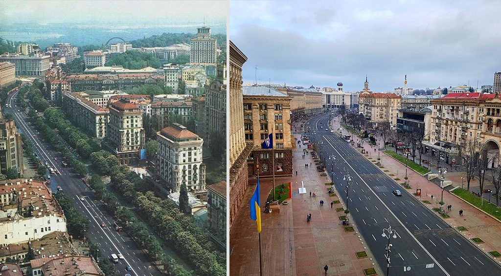 Две фотографии Крещатика с разницей в 30 лет опубликовали в группе на Facebook «Клуб коренного киевлянина». Символом Киева признан каштан, но легко заметить, что каштанов на главной улице столицы стало намного меньше, тротуарной плитки больше и появилось здание с черным стеклянным фасадом.