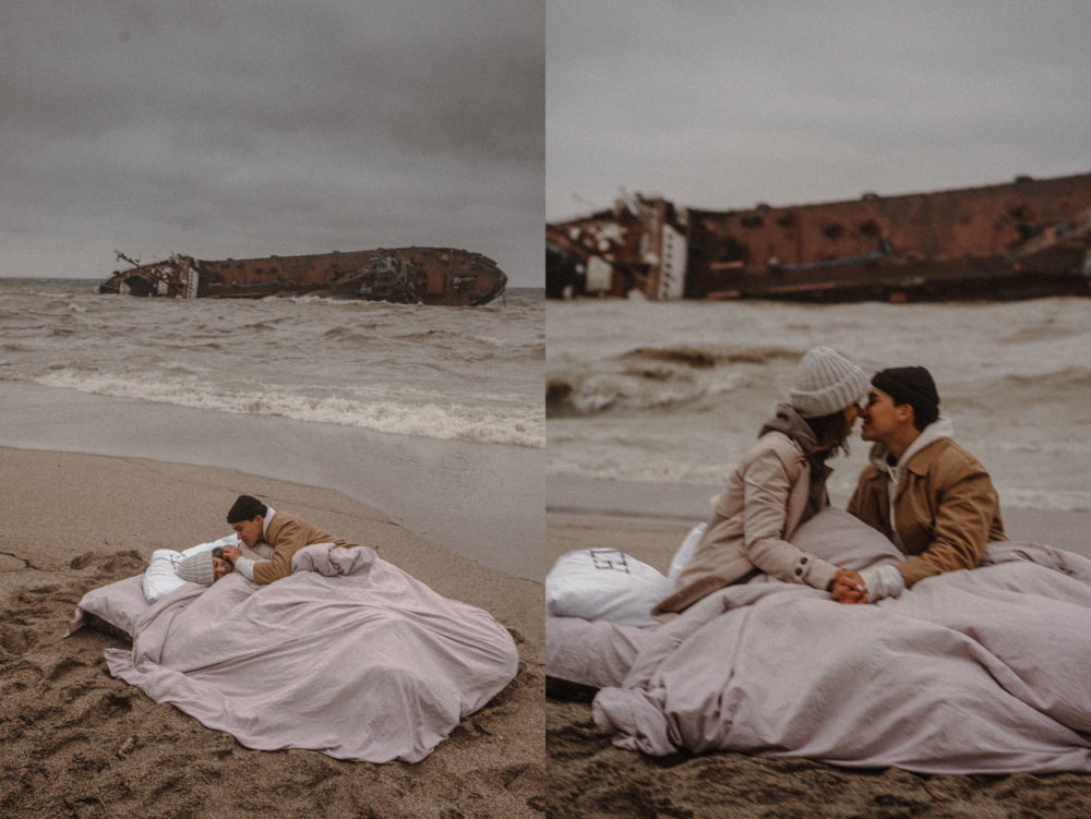 «В процессе поиска пары для этой серии мне трижды сказали, что я не в себе. Шторм. Лютый ветер. Надувной матрас. И по ходу дела нарисовался еще и перевернувшийся танкер. Когда в «Эпицентре» я, парень в огромной дутой куртке и ушанке, спрашивал у консультантов, где я могу найти товары для моря и отдыха, ловил немного странные взгляды», — описывает фотограф процесс съемки в своем Instagram.