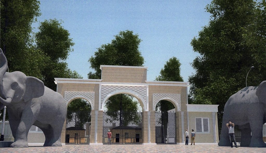Об этом сообщает официальный сайт города. По плану новый вход в одесский зоопарк будет представлять собой каменный портал с тремя арочными проходами и решетчатыми стальными створчатыми воротами. Со стороны Преображенского парка к проходу будут примыкать два одноэтажных павильона, а перед ним собираются установить скульптуры трехметровых азиатских слонов на постаментах.